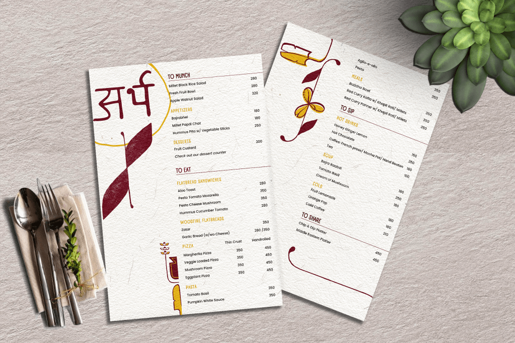 Brand visual identity design for Arth, a culinary haven nestled in the vibrant streets of Jaipur, where every detail tells a story of warmth and flavor. We’ve crafted a visual identity that mirrors the cafe’s inviting atmosphere—a handwritten fusion of Hindi and English script that captures the city’s vibrant spirit. Inspired by the golden hues of mustard fields and the rich palette of spices, the warm and earthy color palette envelops Arth in a comforting embrace, evoking a sense of home and belonging.